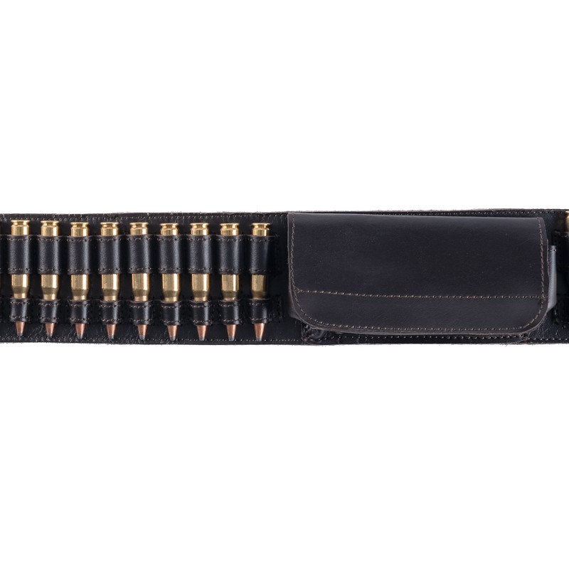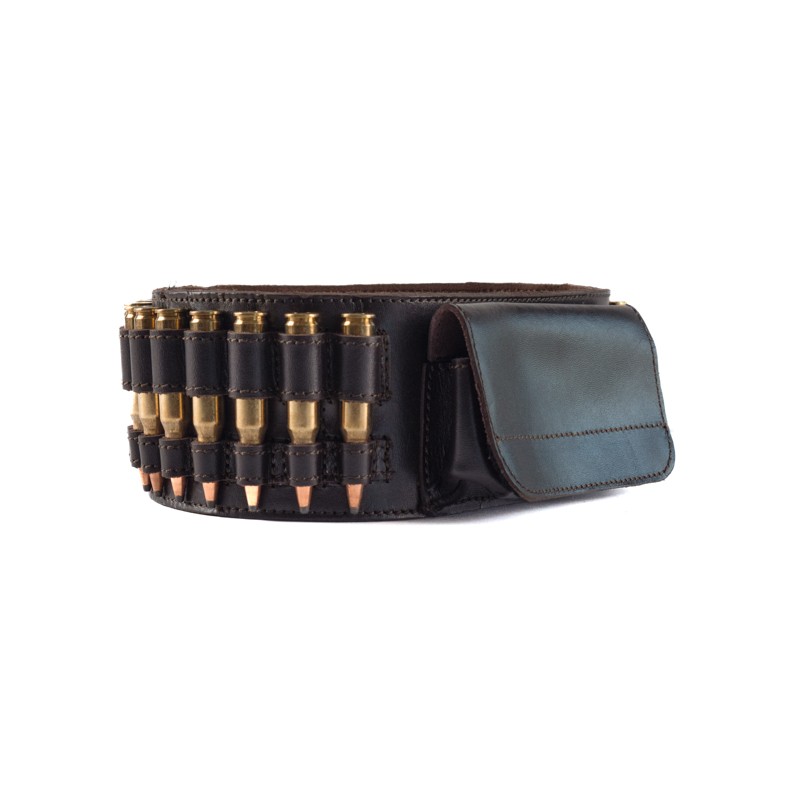 Cartouche de fusil en cuir réglable avec poche centrale. Capacité : 22 coups.