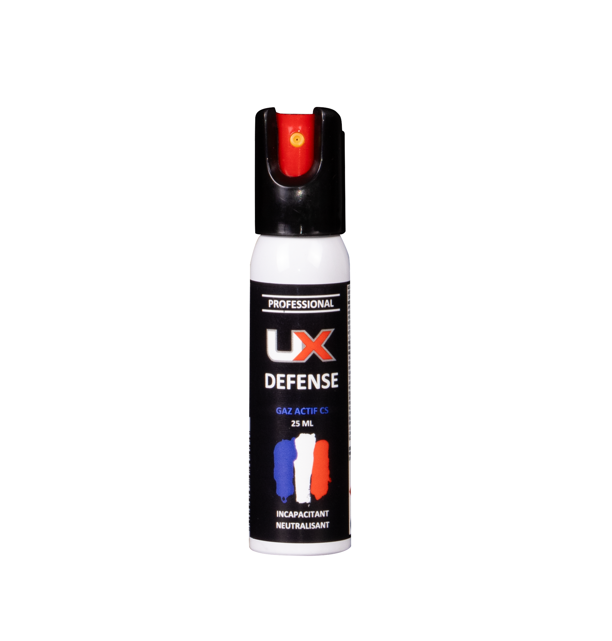 Cette bombe UX au gaz CS diffuse un puissant nuage incapacitant à base de 2-chlorobenzylidène malonitrile (gaz lacrymogène). Son jet diffus atteint plusieurs mètres.