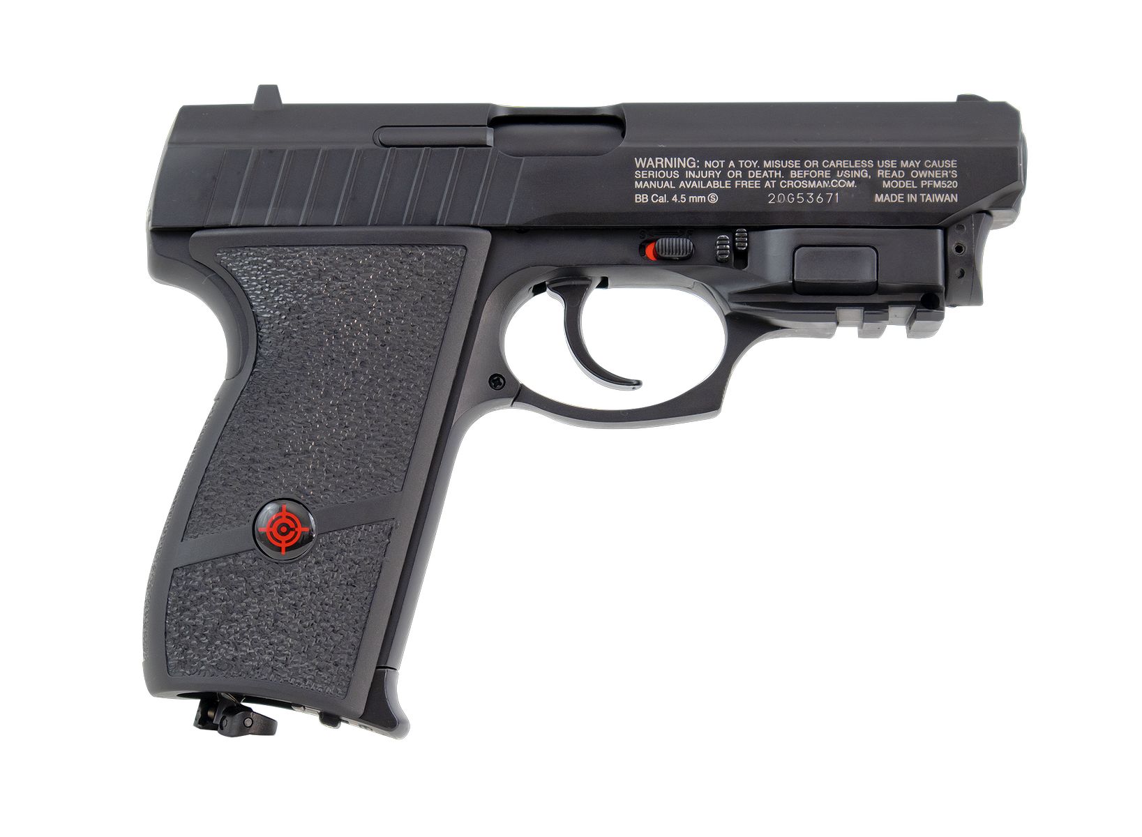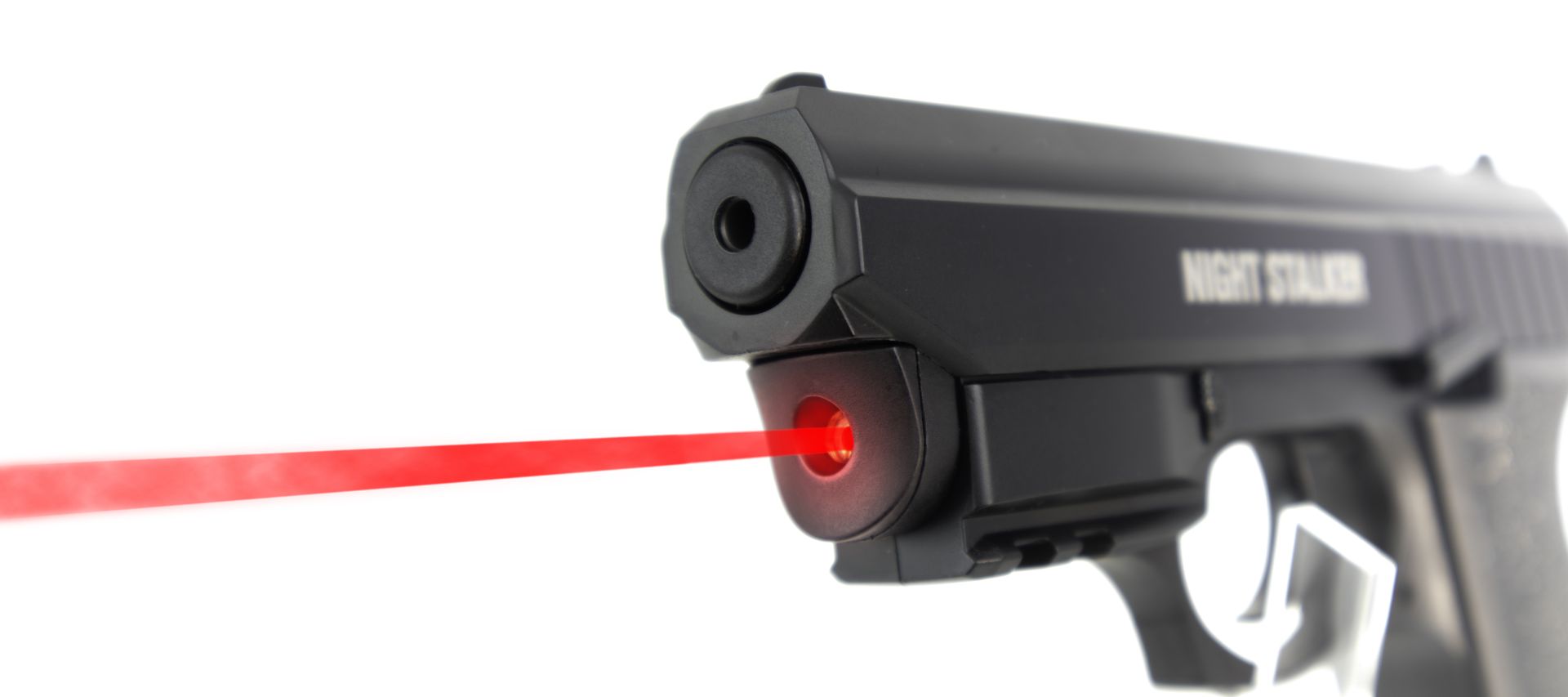 Pistolet C02, équipé d'origine d'un laser CLASS 2 à l'avant, il possède également un rail picatinny permettant la fixation d'une lampe.